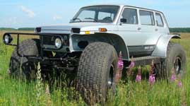 За счет конструкции эластичных тонкостенных шин сверхнизкого давления с высокопрочным кордом автомобиль показывает давление на грунт не более 200 г/кв.см, что позволяет ему передвигаться, не повреждая верхние слои почвы и растительный покров. |