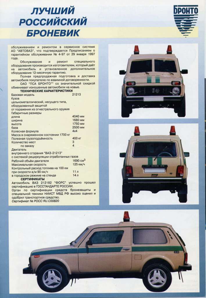 Продукция производства специальных автомобилей АвтоВАЗа (ПСА «Бронто») – бронированные «Нивы» - пользовались неизменным спросом, однако от потребителей поступали нарекания на тесноту в салоне. И без того небольшое пространство салона «Нивы» заметно уменьшала «кольчуга», а ведь на пассажирах и водителе были еще и бронежилеты плюс оружие. Поэтому специалистами «Бронто» была разработана новая версия броневика с удлиненной на 300мм базой, которая получила обозначение ВАЗ-212182 и имя собственное «Форс». Кроме системы бронирования, автомобиль дополнительно оснащался автоматической системой пожаротушения в моторном отсеке, пожаровзрывобезопасным топливным баком, дополнительной аккумуляторной батареей, кондиционером, дистанционным приводом замка правой двери с места водителя. В качестве дополнительного оборудования предлагался бронированный пол, светосигнальные маячки. Поскольку «Форс» из-за бронирования оказался на 430 кг тяжелее, автомобиль комплектовался усиленными амортизаторами, а пружины подвески были изготовлены из прутка увеличенного диаметра. Как правило, выпускались инкассаторские броневики, но существовала и VIP-комплектация со скрытым бронированием (на фото слева).